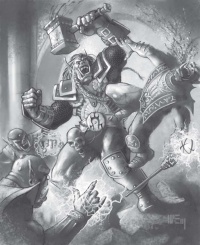 Этот огромный боевой молот вытесан из цельной глыбы чёрного гранита, его боёк насажен на прочную дубовую рукоять и дважды обёрнут кожей с острыми золотыми шипами. За многие годы использования его деревянная рукоятка неоднократно заменялась, основная же часть оставалась неизменной – пошедший на её изготовление гранит ни разу не скололся. Молот закалён и способен усиливать владельца, кроме того, поговаривают, он обладает и другими особыми свойствами (в частности, мощью молнии).